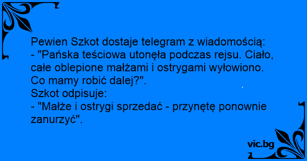 - "Pańska teściowa utonęła podczas rejsu. Ciało, całe oblepione małżami i ostrygami wyłowiono. Co mamy robić dalej?".