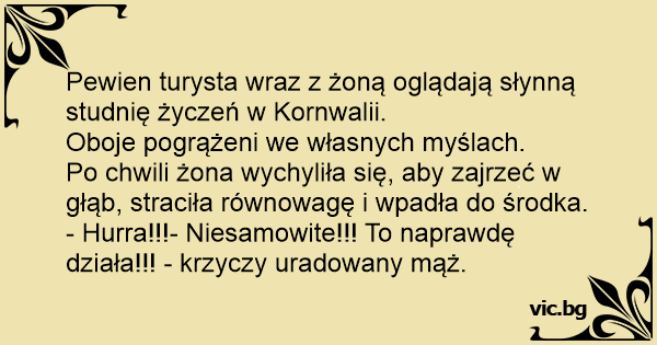 Семейство пътувало и видяло "Кладенец на желанията!" Жената се надвесила и паднала, а мъжът казал: - Я, те много бързо се сбъдват!