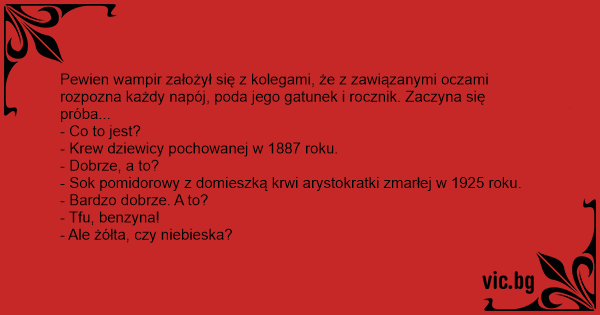 Pewien wampir założył się z kolegami, że z zawiązanymi oczami rozpozna każdy napój, poda jego gatunek i rocznik. Zaczyna się próba...
