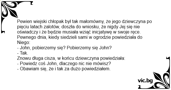 Pewien wiejski chłopak był tak małomówny, że jego dziewczyna po pięciu latach zalotów, doszła do wniosku, że nigdy Jej się nie oświadczy i że będzie musiała wziąć inicjatywę w swoje ręce.