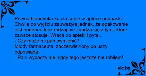 Pewna blondynka kupiła sobie w aptece podpaski. Chwilę po wyjściu zauważyła jednak, że opakowanie jest podobne lecz rodzaj nie zgadza się z tymi, które zawsze stosuje. Wraca do apteki i pyta...