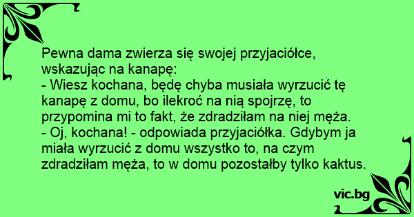 - Wiesz kochana, będę chyba musiała wyrzucić tę kanapę z domu, bo ilekroć na nią spojrzę, to przypomina mi to fakt, że zdradziłam na niej męża.