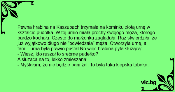 Pewna hrabina na Kaszubach trzymała na kominku złotą urnę w kształcie pudełka. W tej urnie miała prochy swojego męża, którego bardzo kochała. Często do małżonka zaglądała. Raz stwierdziła, że już wyjątkowo długo nie "odwiedzała" męża. Otworzyła urnę, a tam... urna była prawie pusta! No więc hrabina pyta służącą: