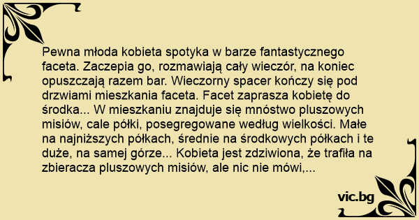 Pewna młoda kobieta spotyka w barze fantastycznego faceta. Zaczepia go, rozmawiają cały wieczór, na koniec opuszczają razem bar. Wieczorny spacer kończy się pod drzwiami mieszkania faceta. Facet zaprasza kobietę do środka... W mieszkaniu znajduje się mnóstwo pluszowych misiów, cale półki, posegregowane według wielkości. Małe na najniższych półkach, średnie na środkowych półkach i te duże, na samej górze... Kobieta jest zdziwiona, że trafiła na zbieracza pluszowych misiów, ale nic nie mówi, jest zaskoczona, ale z drugiej strony cieszy się ze trafiła na takiego uczuciowego i wrażliwego faceta. Odwraca się do niego... całuje go... Zdejmuje suknie... Stało się to, o czym cały wieczór marzyła... Po fantastycznej nocy pełnej namiętności, leży obok swojego wyśnionego faceta i pyta: