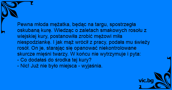 Pewna młoda mężatka, będąc na targu, spostrzegła oskubaną kurę. Wiedząc o zaletach smakowych rosołu z wiejskiej kury, postanowiła zrobić mężowi miła niespodziankę. I jak mąż wrócił z pracy, podała mu świeży rosół. On je, starając się opanować niekontrolowane skurcze mięśni twarzy. W końcu nie wytrzymuje i pyta: