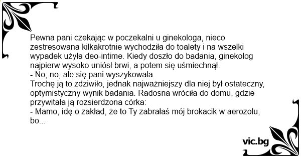 Pewna pani czekając w poczekalni u ginekologa, nieco zestresowana kilkakrotnie wychodziła do toalety i na wszelki wypadek użyła deo-intime. Kiedy doszło do badania, ginekolog najpierw wysoko uniósł brwi, a potem się uśmiechnął.