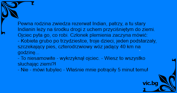 Pewna rodzina zwiedza rezerwat Indian, patrzy, a tu stary Indianin leży na środku drogi z uchem przyciśniętym do ziemi. Ojciec pyta go, co robi. Członek plemienia zaczyna mówić: