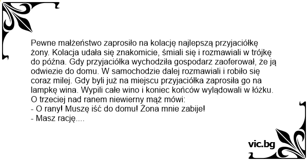 Pewne małżeństwo zaprosiło na kolację najlepszą przyjaciółkę żony. Kolacja udała się znakomicie, śmiali się i rozmawiali w trójkę do późna. Gdy przyjaciółka wychodziła gospodarz zaoferował, że ją odwiezie do domu. W samochodzie dalej rozmawiali i robiło się coraz milej. Gdy byli już na miejscu przyjaciółka zaprosiła go na lampkę wina. Wypili całe wino i koniec końców wylądowali w łóżku.