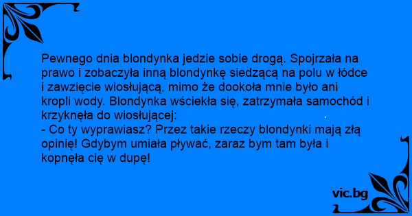 Pewnego dnia blondynka jedzie sobie drogą. Spojrzała na prawo i zobaczyła inną blondynkę siedzącą na polu w łódce i zawzięcie wiosłującą, mimo że dookoła mnie było ani kropli wody. Blondynka wściekła się, zatrzymała samochód i krzyknęła do wiosłującej: