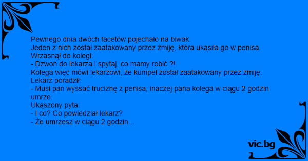 - Musi pan wyssać truciznę z penisa, inaczej pana kolega w ciągu 2 godzin umrze.