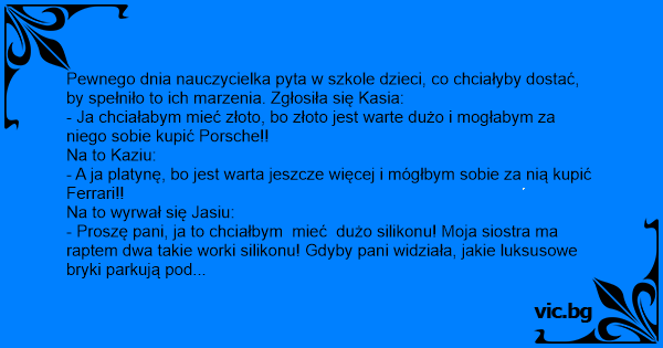 - Proszę pani, ja to chciałbym mieć dużo silikonu! Moja siostra ma raptem dwa takie worki silikonu! Gdyby pani widziała, jakie luksusowe bryki parkują pod naszym domem!
