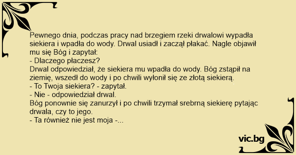 Pewnego dnia, podczas pracy nаd brzegiem rzeki drwalowi wypadła siekiera i wpadła do wody. Drwal usiadł i zaczął płakać. Nagle objawił mu się Bóg i zapytał: