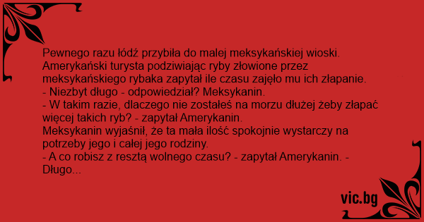 Pewnego razu łódź przybiła do malej meksykańskiej wioski. Amerykański turysta podziwiając ryby złowione przez meksykańskiego rybaka zapytał ile czasu zajęło mu ich złapanie.