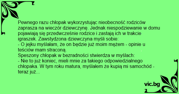 Pewnego razu chłopak wykorzystując nieobecność rodziców zaprasza na wieczór dziewczynę. Jednak niespodziewanie w domu pojawiają się przedwcześnie rodzice i zastają ich w trakcie igraszek. Zawstydzona dziewczyna myśli sobie: