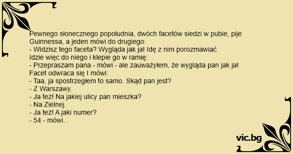 Pewnego słonecznego popołudnia, dwóch facetów siedzi w pubie, pije Guinnessa, a jeden mówi do drugiego: