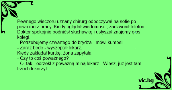 Pewnego wieczoru uznany chirurg odpoczywał na sofie po powrocie z pracy. Kiedy oglądał wiadomości, zadzwonił telefon. Doktor spokojnie podniósł słuchawkę i usłyszał znajomy głos kolegi.