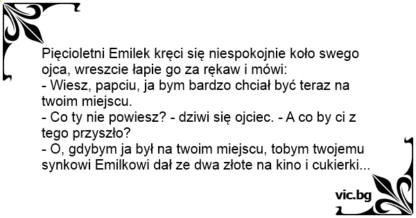 Pięcioletni Emilek kręci się niespokojnie koło swego ojca, wreszcie łapie go za rękaw i mówi: