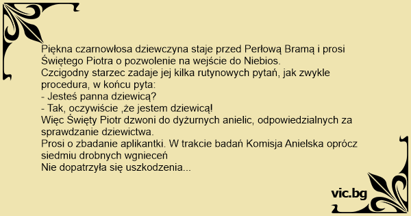 Więc Święty Piotr dzwoni do dyżurnych anielic, odpowiedzialnych za sprawdzanie dziewictwa.