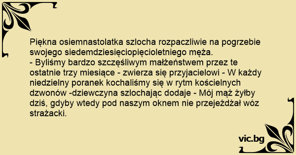 - Byliśmy bardzo szczęśliwym małżeństwem przez te ostatnie trzy miesiące - zwierza się przyjacielowi - W każdy niedzielny poranek kochaliśmy się w rytm kościelnych dzwonów -dziewczyna szlochając dodaje - Mój mąż żyłby dziś, gdyby wtedy pod naszym oknem nie przejeżdżał wóz strażacki.