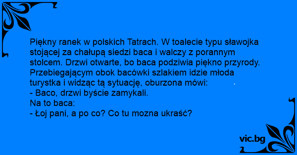 Piękny ranek w polskich Tatrach. W toalecie typu sławojka stojącej za chałupą siedzi baca i walczy z porannym stolcem. Drzwi otwarte, bo baca podziwia piękno przyrody. Przebiegającym obok bacówki szlakiem idzie młoda turystka i widząc tą sytuację, oburzona mówi: