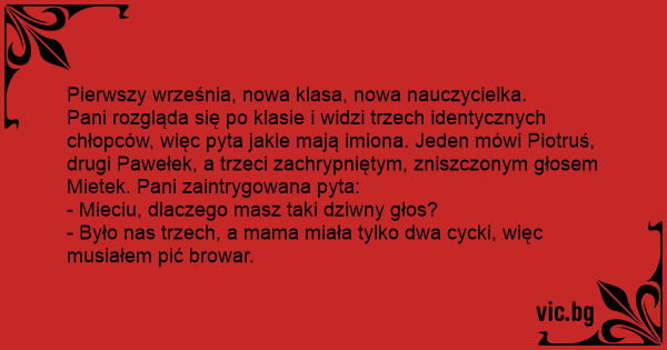 Pani rozgląda się po klasie i widzi trzech identycznych chłopców, więc pyta jakie mają imiona. Jeden mówi Piotruś, drugi Pawełek, a trzeci zachrypniętym, zniszczonym głosem Mietek. Pani zaintrygowana pyta: