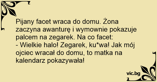 Pijany facet wraca do domu. Żona zaczyna awanturę i wymownie pokazuje palcem na zegarek. Na co facet: