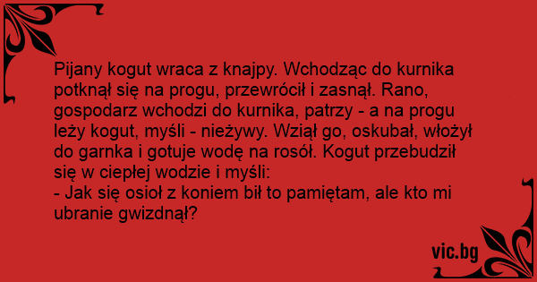 Pijany kogut wraca z knajpy. Wchodząc do kurnika potknął się na progu, przewrócił i zasnął. Rano, gospodarz wchodzi do kurnika, patrzy - a na progu leży kogut, myśli - nieżywy. Wziął go, oskubał, włożył do garnka i gotuje wodę na rosół. Kogut przebudził się w ciepłej wodzie i myśli:
