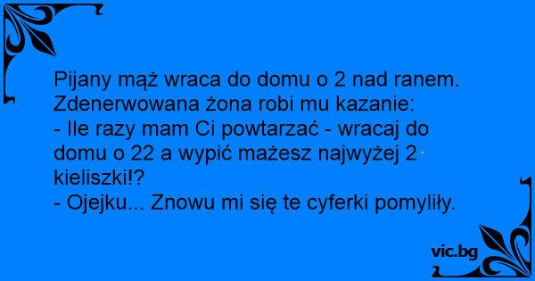 - Ile razy mam Ci powtarzać - wracaj do domu o 22 a wypić mażesz najwyżej 2 kieliszki!?