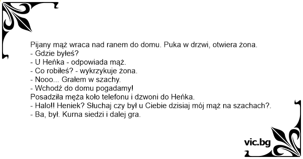 - Halo!! Heniek? Słuchaj czy był u Ciebie dzisiaj mój mąż na szachach?.