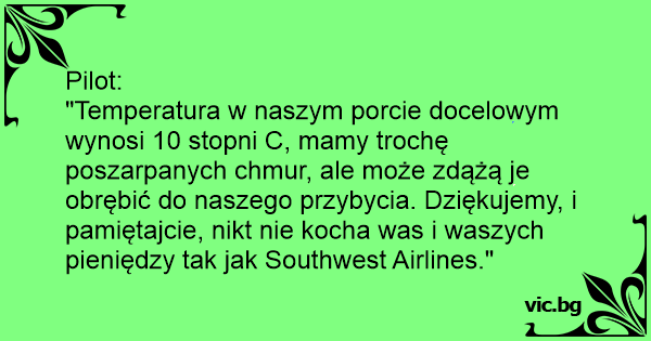 "Temperatura w naszym porcie docelowym wynosi 10 stopni C, mamy trochę poszarpanych chmur, ale może zdążą je obrębić do naszego przybycia. Dziękujemy, i pamiętajcie, nikt nie kocha was i waszych pieniędzy tak jak Southwest Airlines."