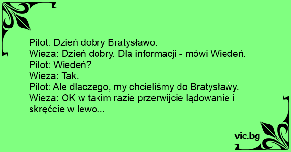 Пилот: Добро утро, Братислава. Кулата: Добро утро. За информация, ние сме Виена. - Виена? - Ами да. - Ама ние искахме да отидем в Братислава. - Ами добре, прекратете кацането си, издигнете се...