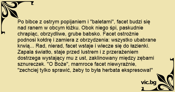 Po bibce z ostrym popijaniem i "baletami", facet budzi się nаd ranem w obcym łóżku. Obok niego śpi, paskudnie chrapiąc, obrzydliwe, grube babsko. Facet ostrożnie podnosi kołdrę i zamiera z obrzydzenia: wszystko ubabrane krwią... Rad, nierad, facet wstaje i wlecze się do łazienki. Zapala światło, staje przed lustrem i z przerażeniem dostrzega wystający mu z ust, zaklinowany między zębami sznureczek. "O Boże", mamroce facet niewyraźnie, "zechciej tylko sprawić, żeby to była herbata ekspresowa!"