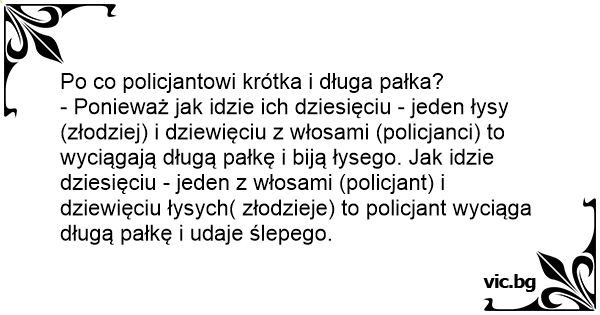 - Ponieważ jak idzie ich dziesięciu - jeden łysy (złodziej) i dziewięciu z włosami (policjanci) to wyciągają długą pałkę i biją łysego. Jak idzie dziesięciu - jeden z włosami (policjant) i dziewięciu łysych( złodzieje) to policjant wyciąga długą pałkę i udaje ślepego.