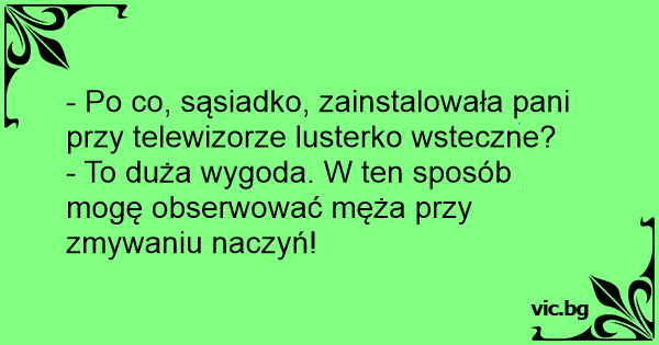 - Po co, sąsiadko, zainstalowała pani przy telewizorze lusterko wsteczne?