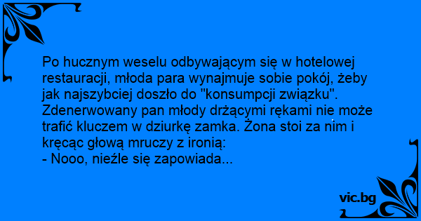 Po hucznym weselu odbywającym się w hotelowej restauracji, młoda para wynajmuje sobie pokój, żeby jak najszybciej doszło do "konsumpcji związku". Zdenerwowany pan młody drżącymi rękami nie może trafić kluczem w dziurkę zamka. Żona stoi za nim i kręcąc głową mruczy z ironią: