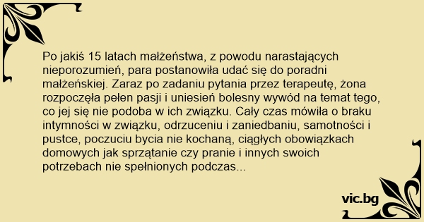 Po jakiś 15 latach małżeństwa, z powodu narastających nieporozumień, para postanowiła udać się do poradni małżeńskiej. Zaraz po zadaniu pytania przez terapeutę, żona rozpoczęła pełen pasji i uniesień bolesny wywód na temat tego, co jej się nie podoba w ich związku. Cały czas mówiła o braku intymności w związku, odrzuceniu i zaniedbaniu, samotności i pustce, poczuciu bycia nie kochaną, ciągłych obowiązkach domowych jak sprzątanie czy pranie i innych swoich potrzebach nie spełnionych podczas małżeństwa.