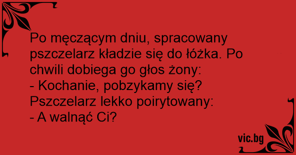 Po męczącym dniu, spracowany pszczelarz kładzie się do łóżka. Po chwili dobiega go głos żony: