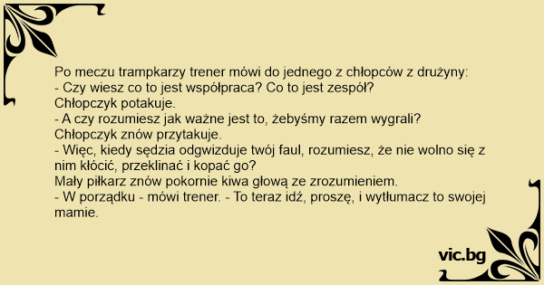 - W porządku - mówi trener. - To teraz idź, proszę, i wytłumacz to swojej mamie.