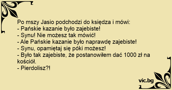 Po mszy Jasio podchodzi do księdza i mówi: