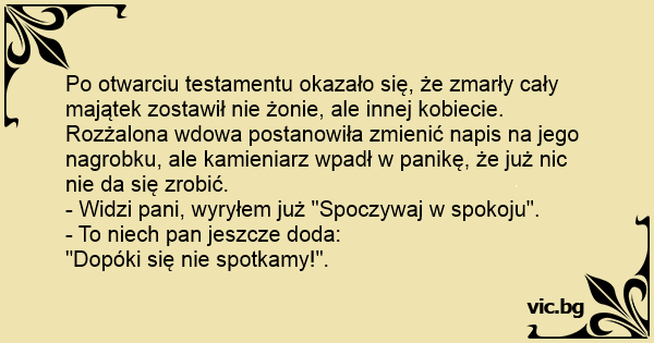 Po otwarciu testamentu okazało się, że zmarły cały majątek zostawił nie żonie, ale innej kobiecie. Rozżalona wdowa postanowiła zmienić napis na jego nagrobku, ale kamieniarz wpadł w panikę, że już nic nie da się zrobić.