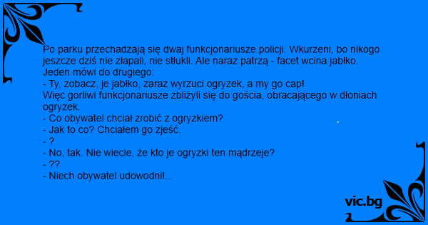 Po parku przechadzają się dwaj funkcjonariusze policji. Wkurzeni, bo nikogo jeszcze dziś nie złapali, nie stłukli. Ale naraz patrzą - facet wcina jabłko. Jeden mówi do drugiego: