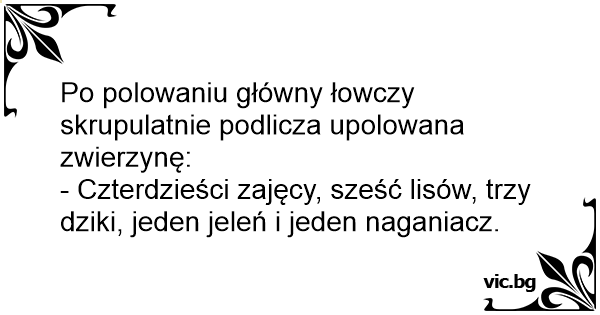 - Czterdzieści zajęcy, sześć lisów, trzy dziki, jeden jeleń i jeden naganiacz.