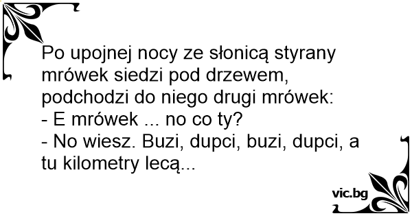 Po upojnej nocy ze słonicą styrany mrówek siedzi pod drzewem, podchodzi do niego drugi mrówek: