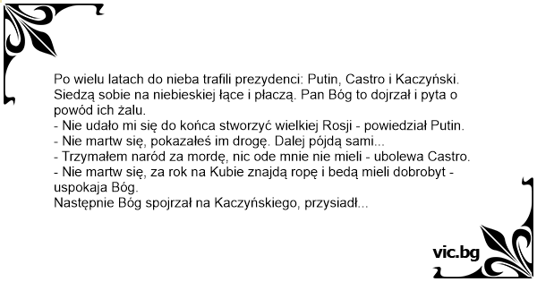 Po wielu latach do nieba trafili prezydenci: Putin, Castro i Kaczyński. Siedzą sobie na niebieskiej łące i płaczą. Pan Bóg to dojrzał i pyta o powód ich żalu.