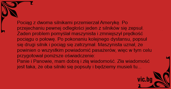 Pociąg z dwoma silnikami przemierzał Amerykę. Po przejechaniu pewnej odległości jeden z silników się zepsuł. Żaden problem pomyślał maszynista i zmniejszył prędkość pociągu o połowę. Po pokonaniu kolejnego dystansu, popsuł się drugi silnik i pociąg się zatrzymał. Maszynista uznał, że powinien o wszystkim powiadomić pasażerów, więc w tym celu przygotował poniższe oświadczenie: