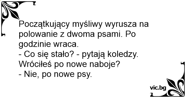 Początkujący myśliwy wyrusza na polowanie z dwoma psami. Po godzinie wraca.