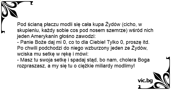 Pod ścianą płaczu modli się cała kupa Żydów (cicho, w skupieniu, każdy sobie cos pod nosem szemrze) wśród nich jeden Amerykanin głośno zawodzi: