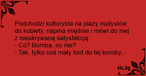 Podchodzi kulturysta na plaży nudystów do kobiety, napina mięśnie i mówi do niej z nieukrywaną satysfakcją: