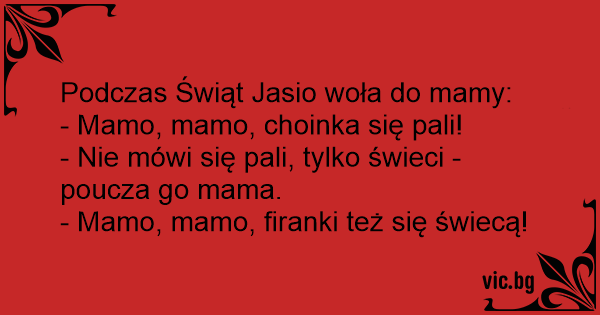 - Mamo! Mamo! Choinka się pali. - Nie mówi się choinka się pali tylko choinka się świeci. Dziecko wraca po 5 minutach: - Mamo! Mamo! Firanki się świecą.