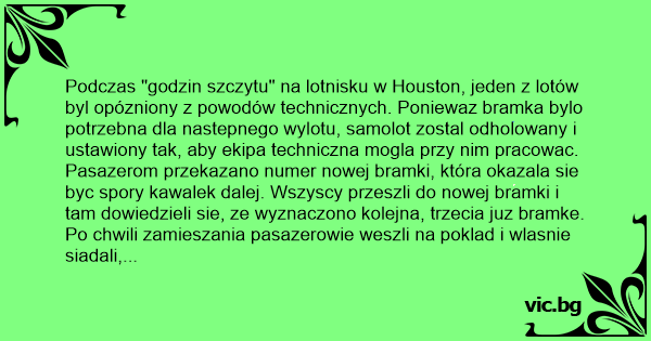 Podczas "godzin szczytu" na lotnisku w Houston, jeden z lotów byl opózniony z powodów technicznych. Poniewaz bramka bylo potrzebna dla nastepnego wylotu, samolot zostal odholowany i ustawiony tak, aby ekipa techniczna mogla przy nim pracowac. Pasazerom przekazano numer nowej bramki, która okazala sie byc spory kawalek dalej. Wszyscy przeszli do nowej bramki i tam dowiedzieli sie, ze wyznaczono kolejna, trzecia juz bramke. Po chwili zamieszania pasazerowie weszli na poklad i wlasnie siadali, gdy stewardessa oglosila przez glosniki: